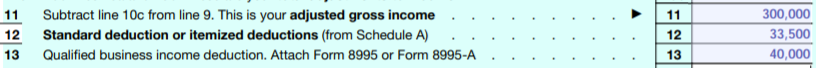 Moving down the first page of the 1040, we can see that Bob and Sue are itemizing deductions: line 12 is larger than the 2020 standard deduction of $24,800 for MFJ.
