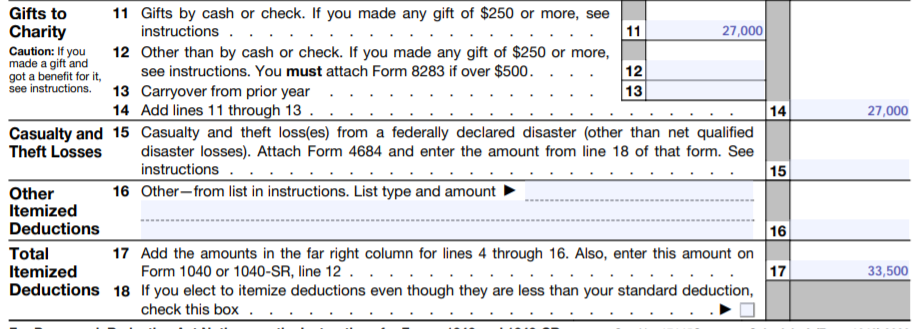 Of their $33,500 in itemized deductions, $27,000 is from charitable giving. This is important because there is a lot of discretion over when and how these contributions are made.
