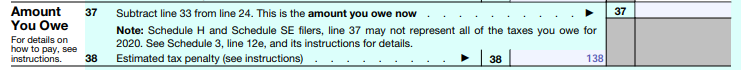 In the example above, Bob and Sue paid an underpayment penalty even though they didn’t owe additional taxes at the end of the year (Line 37). Taxes are pay-as-you-go, but they didn’t make sufficient payments early in the year.